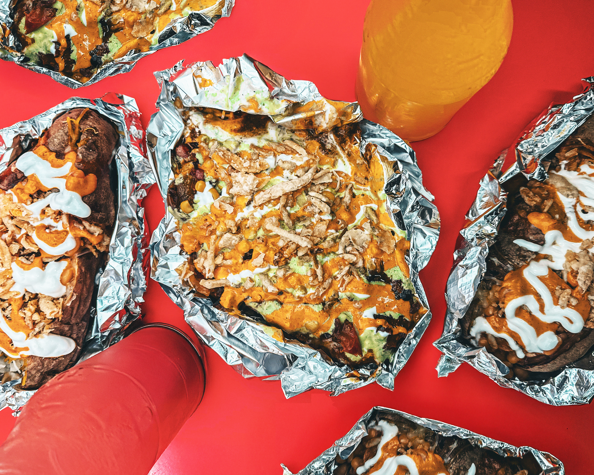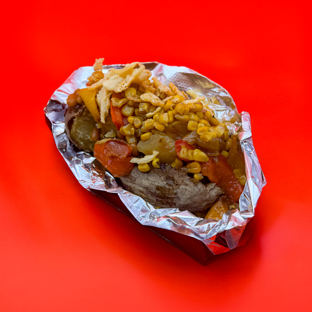 Our menu is all about loaded baked potatoes—crispy on the outside, fluffy inside, and stacked with toppings like Chipotle chicken, baked beans, and melty cheese. Pick one of our signature plates or build your own spud masterpiece.